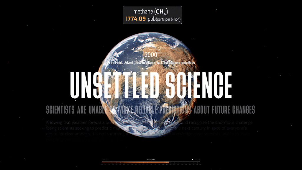 Smoke and Mirrors is an unusual blend of music video and science visualisation. This short and poignant work emphasizes the magnitude of the climate crisis, by presenting not only scientific facts about global warming but also the dangerous ideological positions which have been denying it over the past few decades. Rising methane levels are therefore illustrated alongside historical advertising slogans employed by oil companies meant to endanger credibility of climate emergency. The visualization is based on NASA’s Blue Marble image and set to Oh My Heart, which was released as the world’s first bioplastic record by Beatie Wolfe.